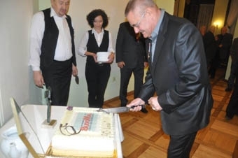 Andrzej Jankowski (Firma Budowlana BUDOMAL) dzieli tort.